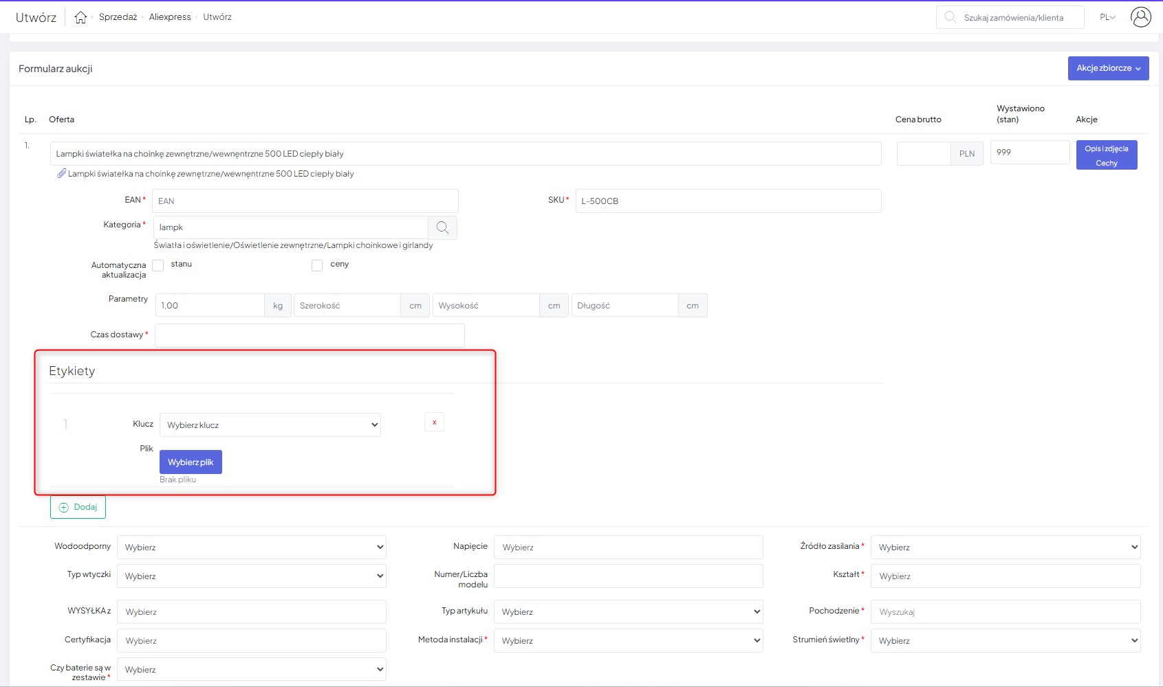 Aby dodać wymagane zdjęcia w formularzu wystawiania najpierw wybierz kategorię produktu, a następnie pojawi się pole „Etykieta”: