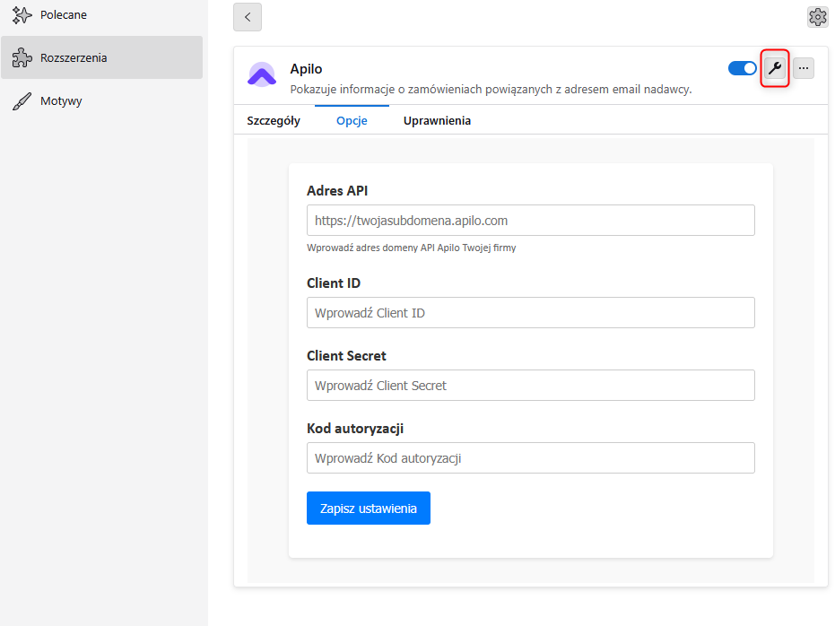 Następnie przejdź do zakładki “rozszerzenia” i kliknij w opcję dodatku i uzupełnij pola wpisując dane, które zostały wygenerowane w Nowej aplikacji REST API, która została przez ciebie dodana w Apilo