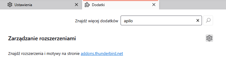 Na swoim koncie Thunderbird kliknij w zębate kółko w lewym dolnym rogu -> wybierz dodatki i motywy następnie wyszukaj na liście Apilo i kliknij przycisk “zainstaluj”.