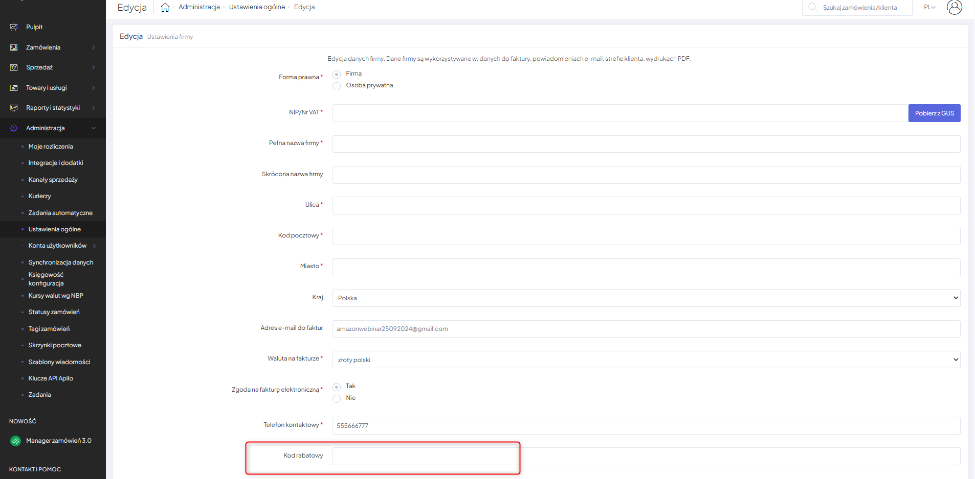 Miejsce na kod rabatowy znajduje się w dolnej części formularza. Po zapisaniu zmian w formularzu kod zostanie aktywowany.