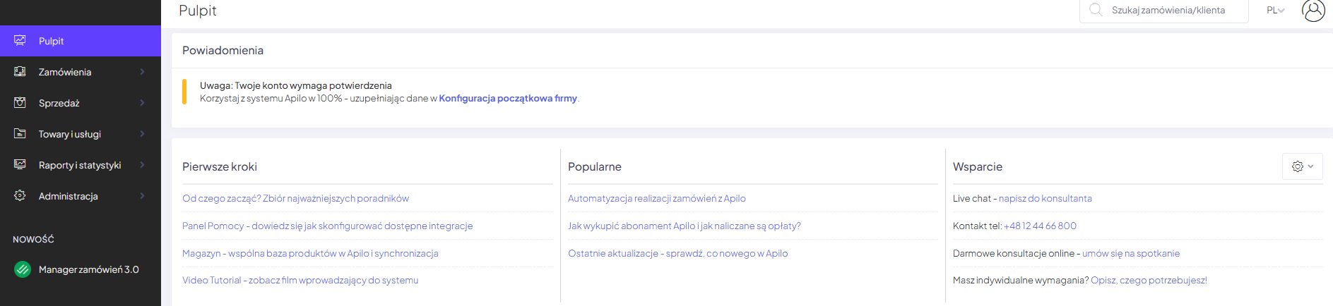 Kliknij w powiadomienie dotyczące konfiguracji konta po zalogowaniu w swoim Apilo.