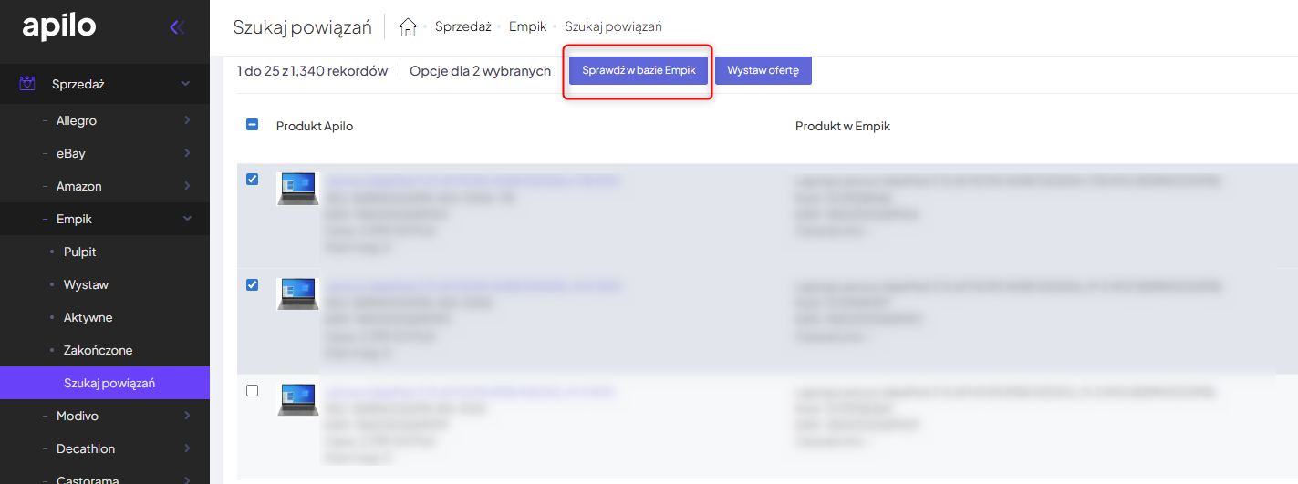 - Znajdź powiązania EAN między produktami w magazynie Apilo, a bazą Empik w zakładce Sprzedaż → Empik → Szukaj Powiązań