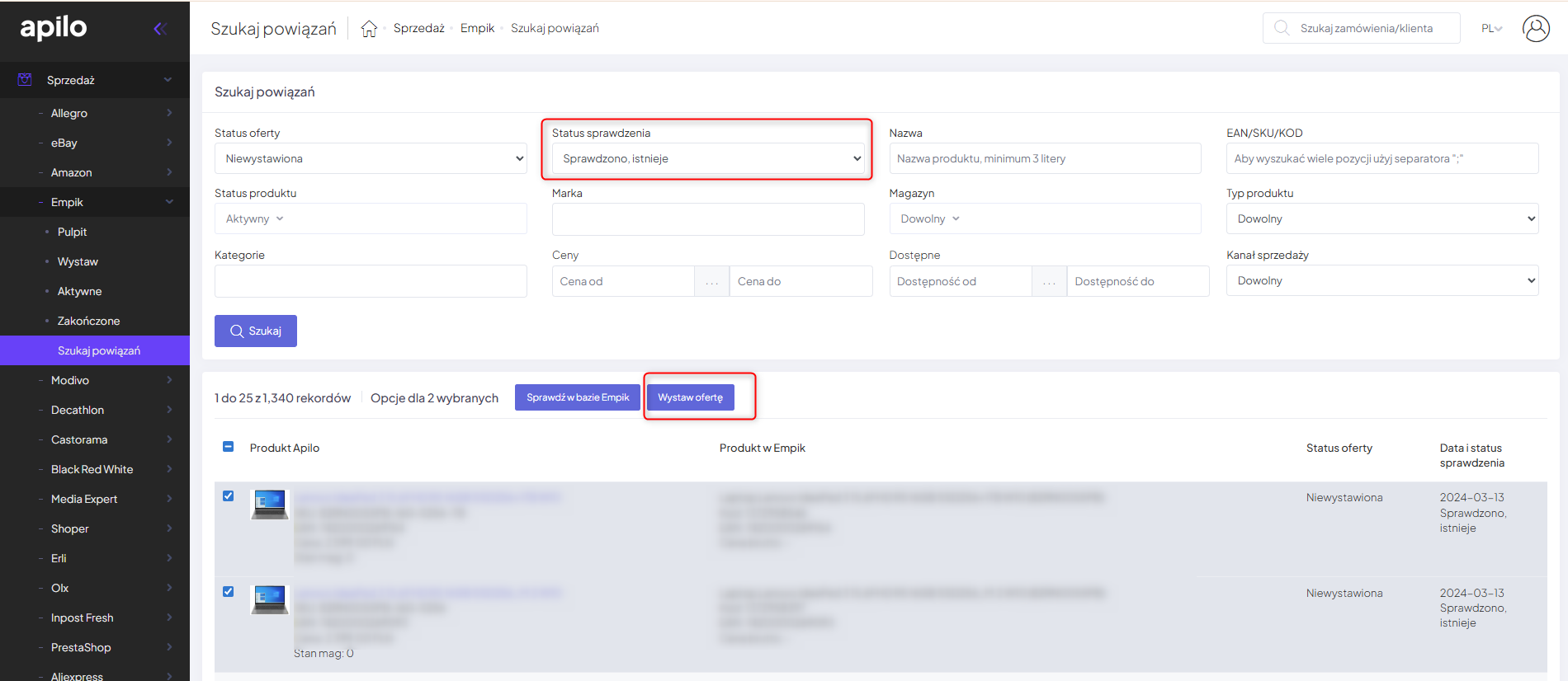 - W zakładce Sprzedaż → Empik → Szukaj Powiązań ustaw filtr „Status sprawdzenia” na „Sprawdzono, istnieje”