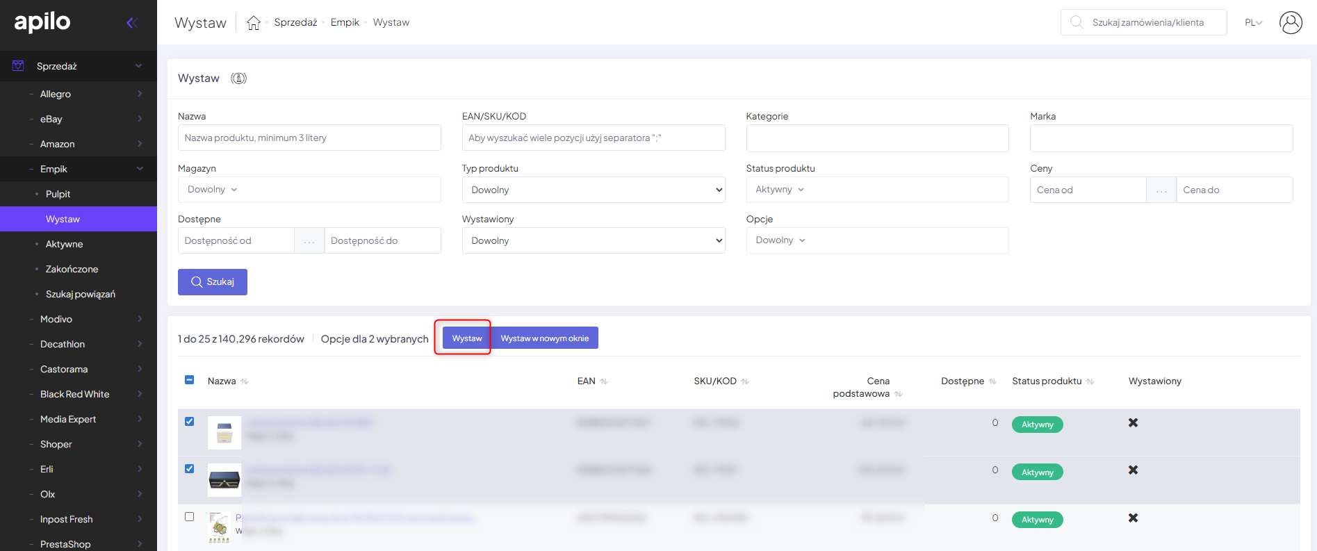 - Przejdź do zakładki Sprzedaż → Empik → Wystaw