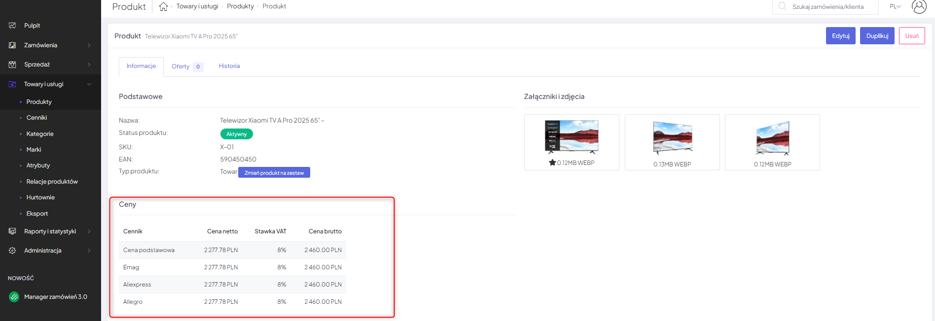 3. W rubryce „Ceny” pojawi się dodatkowy wpis opisany nazwą Cennika: