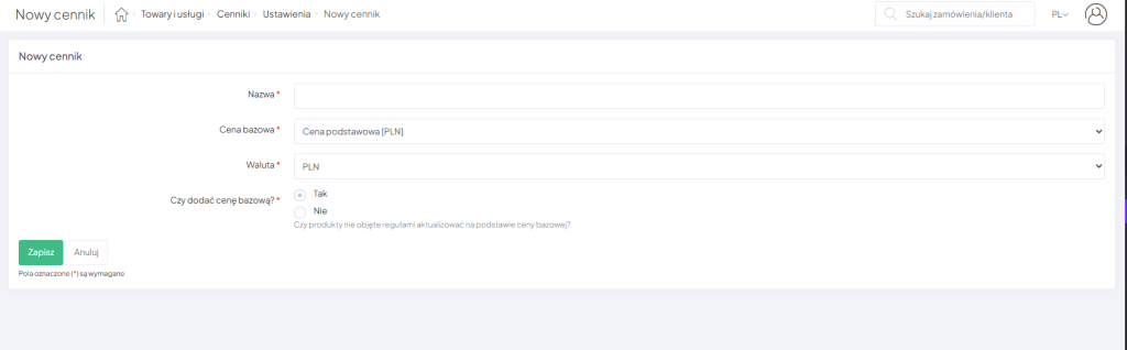 2. Nazwij swój cennik – uzupełnij informacje co ma być ceną bazową, w jakiej walucie ma on być i czy ma dodać cenę bazową.