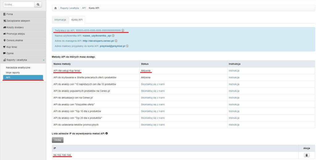 - Do znajdującej się poniżej listy adresów IP mogących korzystać z API należy dodać następujące adresy IP: