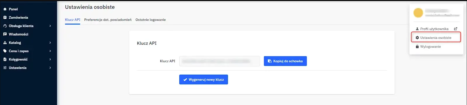 – Klucz API nie został wygenerowany, wybieramy „wygeneruj nowy klucz” -> „Kopiuj do schowka”