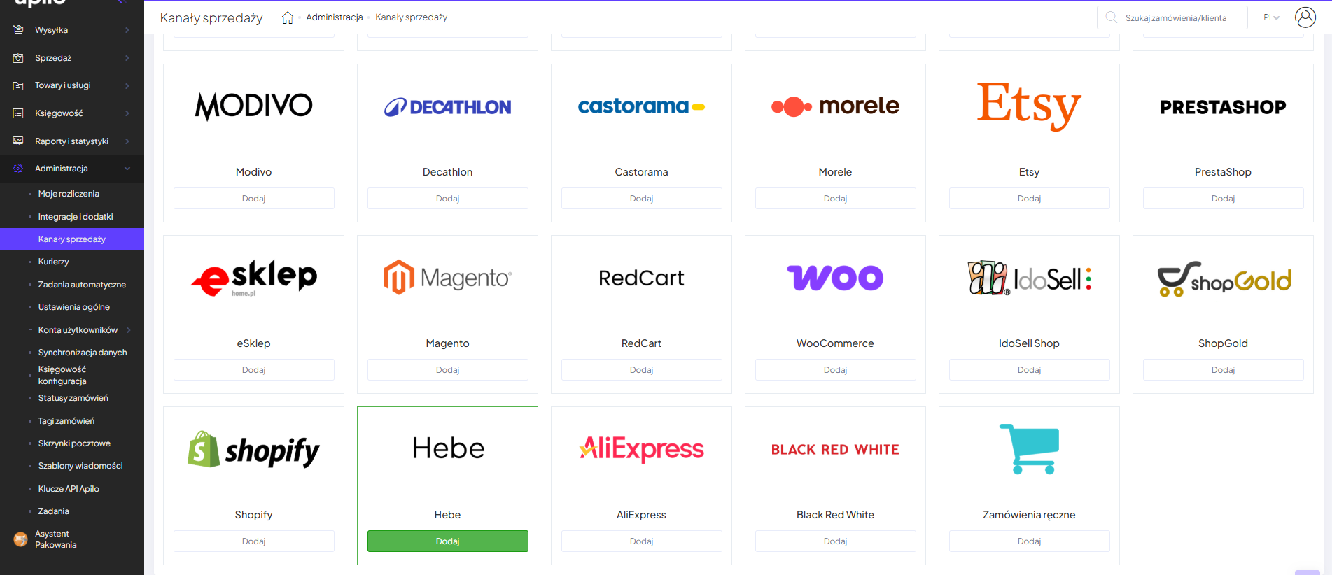 - Przejdź do Administracja → Kanały sprzedaży
