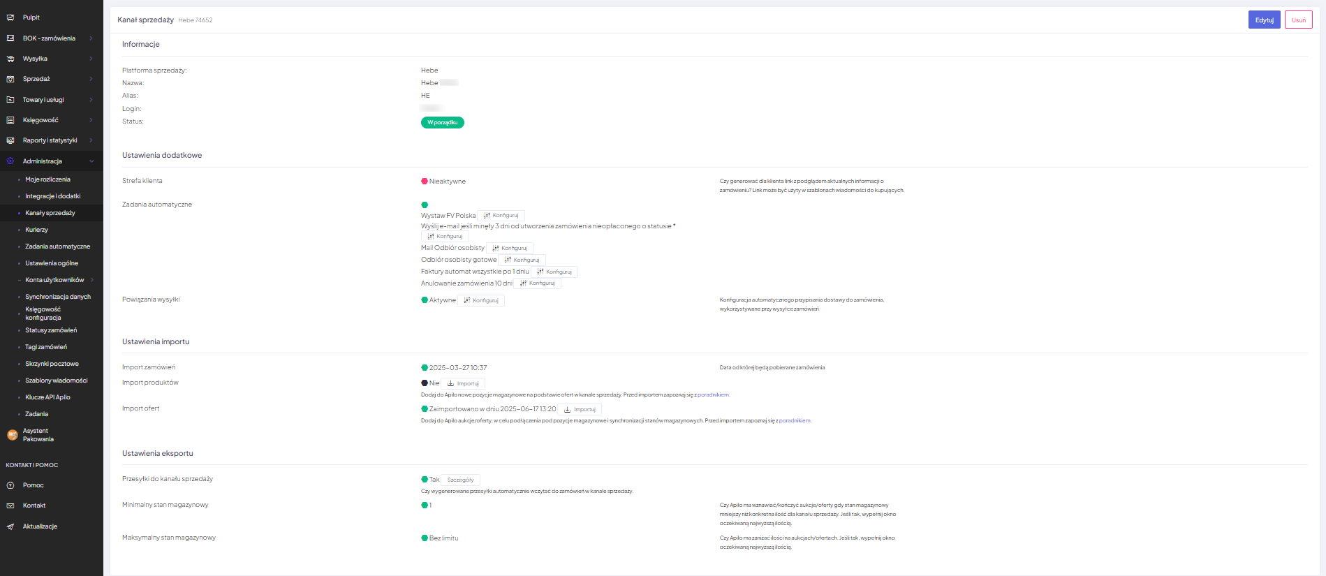Aby przejść do dalszej konfiguracji kanału sprzedaży należy przejść do zakładki: Administracja -> Kanały sprzedaży -> Hebe – kliknij w nazwę podłączonego konta.