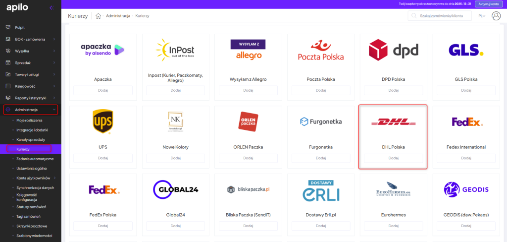 2. Przejdź do: Administracja > Kurierzy i z listy dostępnych kurierów wybierz DHL Polska klikając w dodaj „Dodaj”