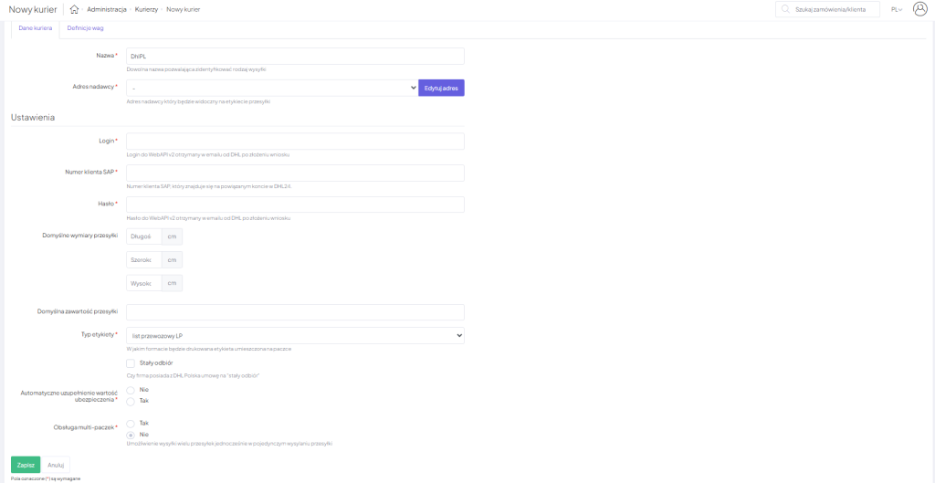 - Domyślne wymiary przesyłki oraz Domyślna zawartość przesyłki – wpisz, jeśli chcesz, aby dane zostały domyślnie wpisane w formularzu