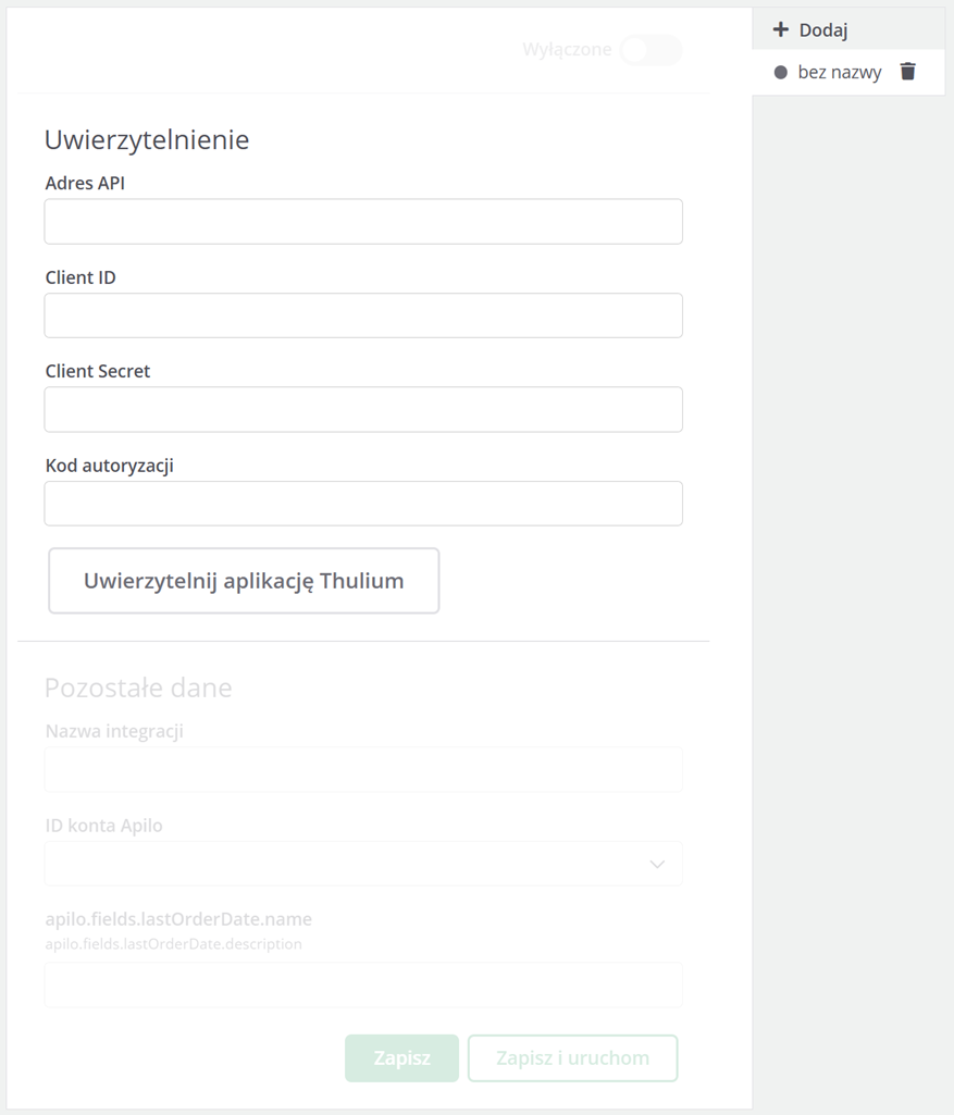 - Jeżeli pozostałe dane zostały wprowadzone w ramach konfiguracji integracji w panelu Thulium to takową integrację można zapisać klikając „zapisz” bądź zapisać i jedocześnie uruchomić klikając „zapisz i uruchom”.