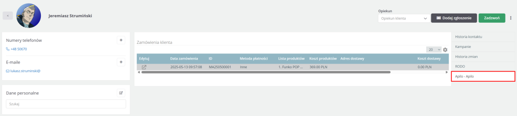 Po prawej stronie pojawia się nowa zakładka Apilo, w której znajdują się podstawowe informacje na temat zamówień klienta.