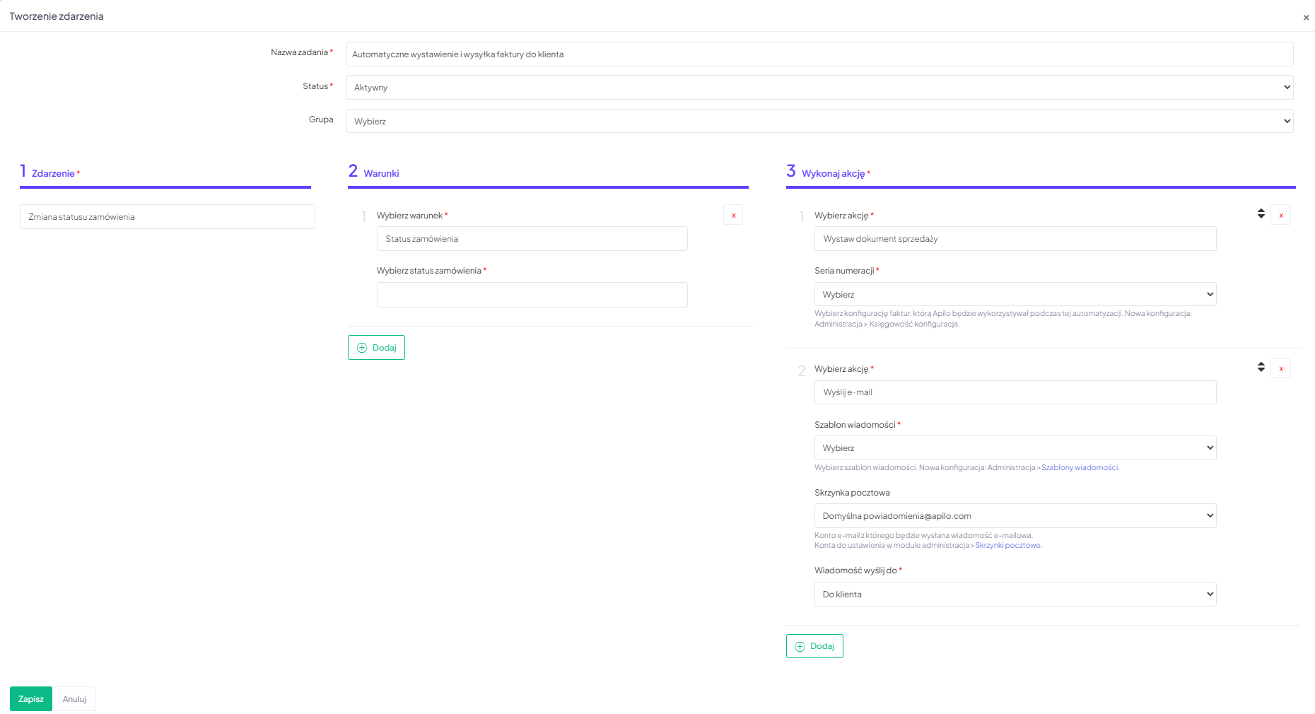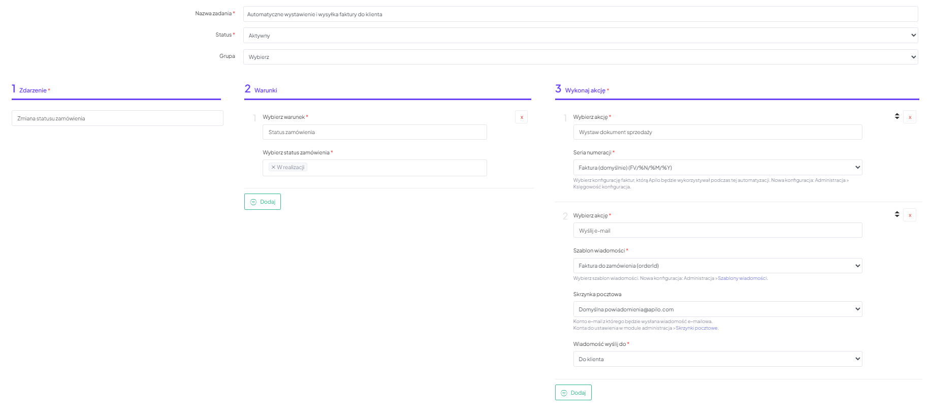 W przypadku odwrotnego ustawienia kolejności, klient otrzyma wiadomość e-mail bez załączonej faktury, a akcja wystawienia dokumentu zostanie wykonana później. Prawidłowe działanie wymaga zatem precyzyjnego ustawienia kroków.