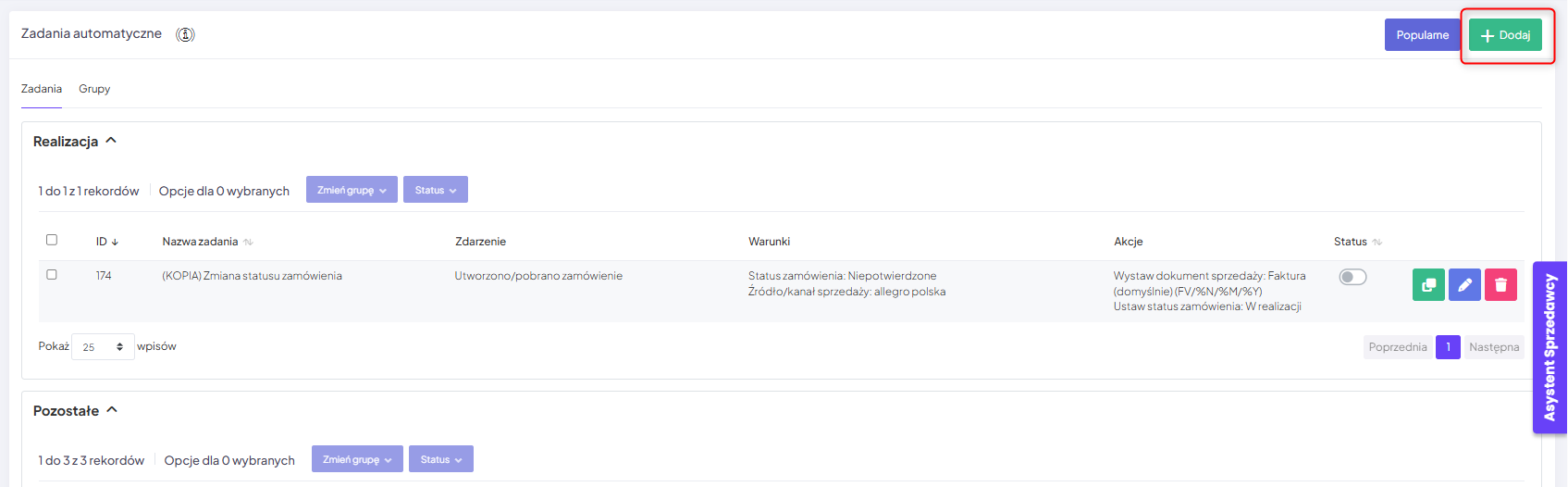- możesz dodać go do stworzonej, dedykowanej grupy zadań automatycznych. Jeśli nie masz stworzonych dedykowanych grup, stworzone zadanie automatyczne pojawi się w sekcji “Pozostałe”.