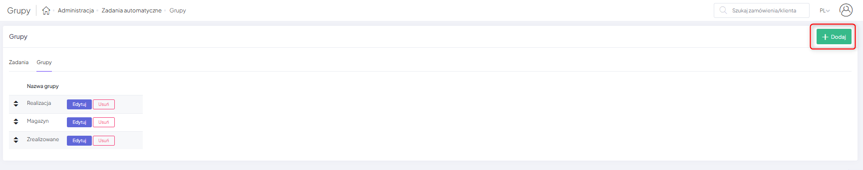 Za pomocą suwaka możesz dowolnie zmieniać kolejność wyświetlania stworzonych grup, co jest natychmiast widoczne w sekcji Zadań automatycznych.