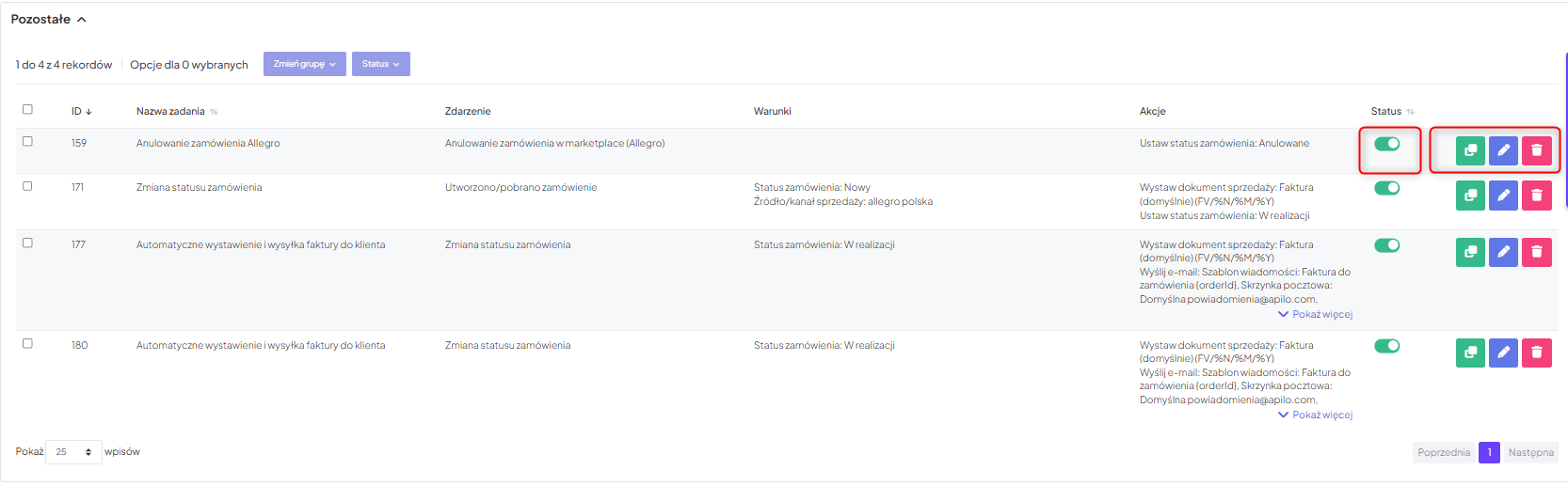Z poziomu listy zadań automatycznych, obok każdego wpisu, dostępne są intuicyjne, ikonograficzne przyciski, pozwalające na wykonanie następujących operacji dla konkretnego zadania: